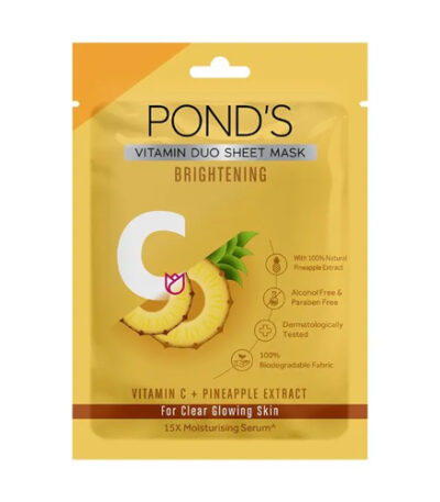Pond’s Brightening Pineapple Sheet Mask 25ml – infused with Vitamin C and pineapple extract for instant glow and hydration. Shop fresh from Shanti Fresh Bhubaneswar.