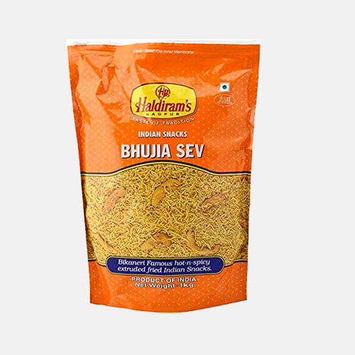 Haldiram’s Nagpur Bhujia Sev 1kg – spicy, crunchy Rajasthani namkeen made from besan and authentic Indian spices. Perfect tea-time snack for all ages.