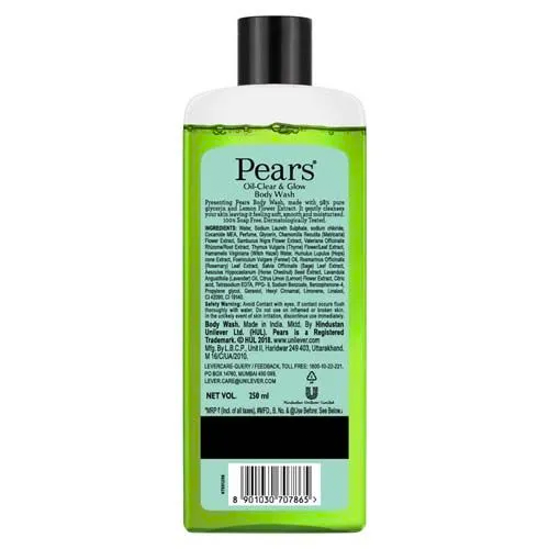 Pears Oil Clear & Glow Body Wash 250ml – gentle, soap-free cleanser with glycerin and lemon flower extracts for clear, glowing skin. Buy online from Shanti Fresh Bhubaneswar.